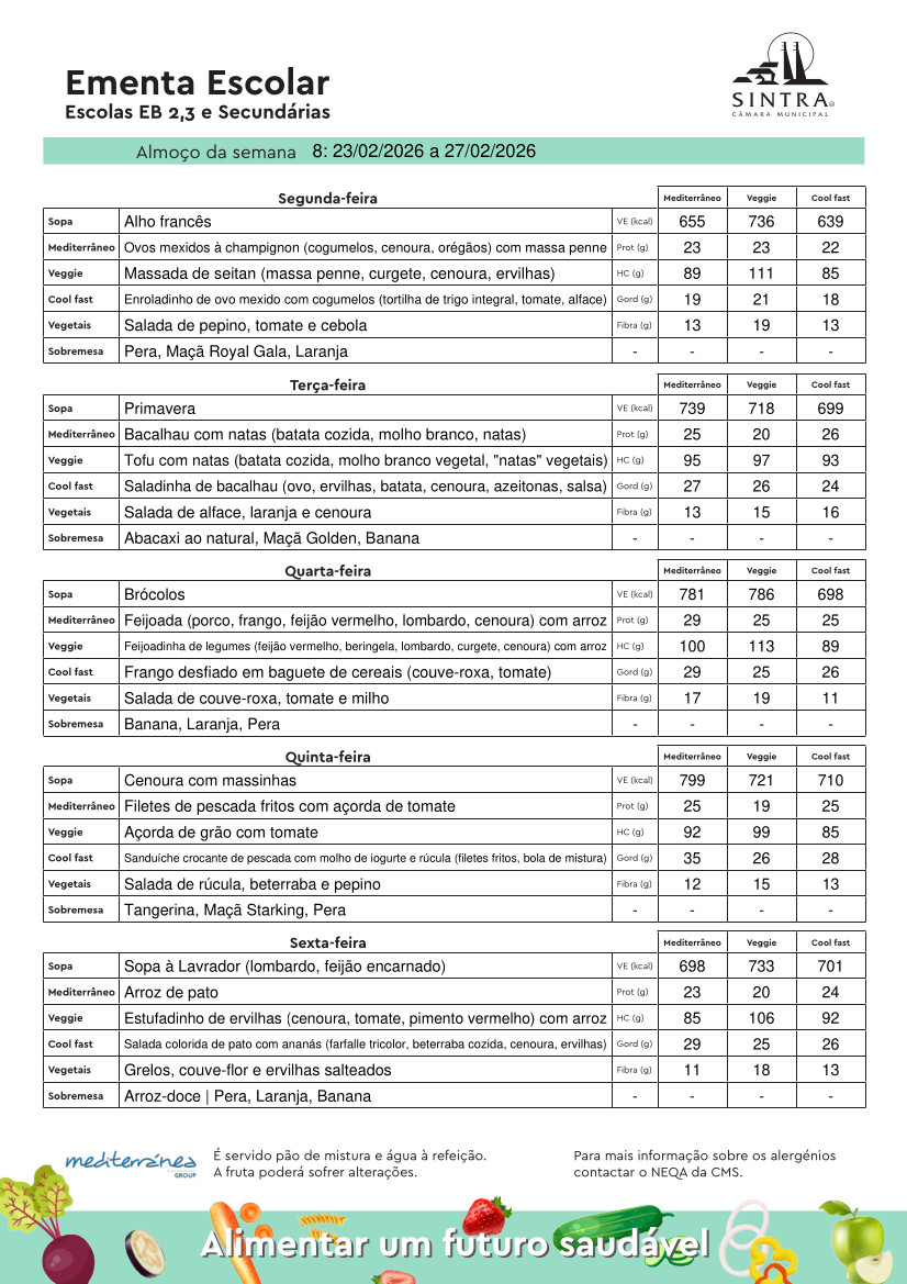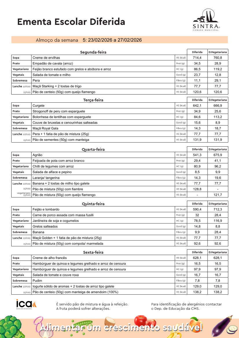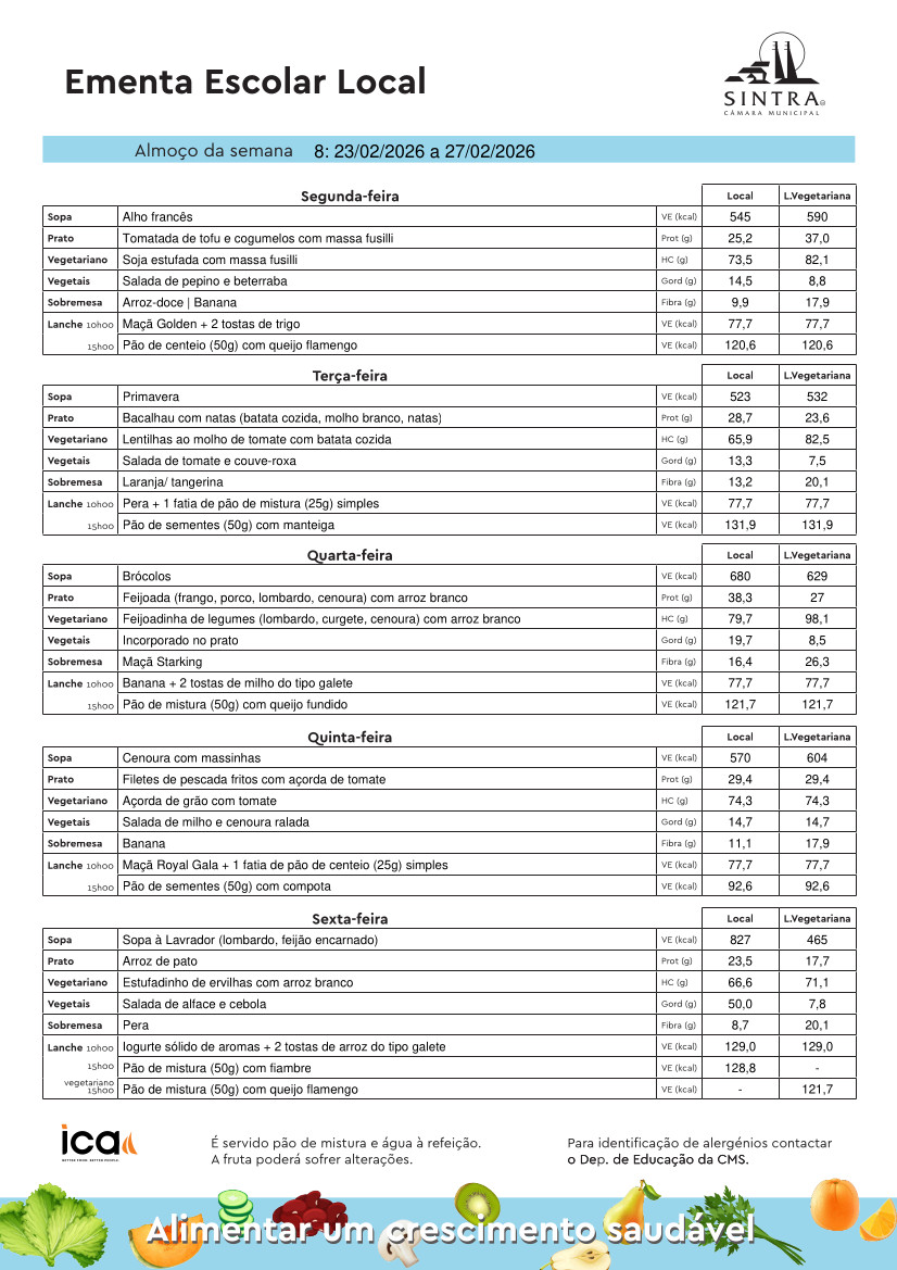 Conheça aqui a ementa das refeições escolares, disponíveis na semana de 23 a 27 de fevereiro de 2026.
