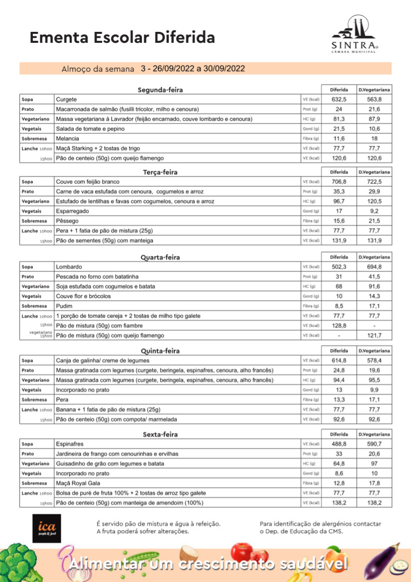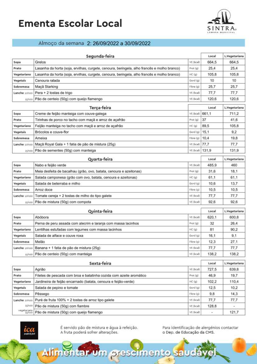 Conheça aqui a ementa das refeições escolares, disponíveis na semana de 26 a 30 de setembro.