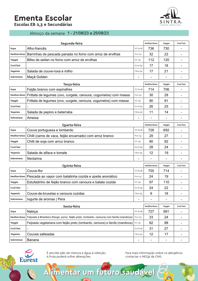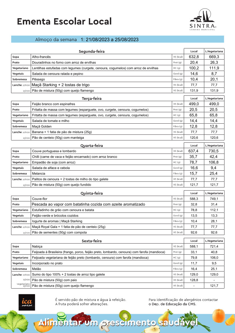 Conheça aqui a ementa das refeições escolares, disponíveis na semana de 21 a 25 de agosto.
